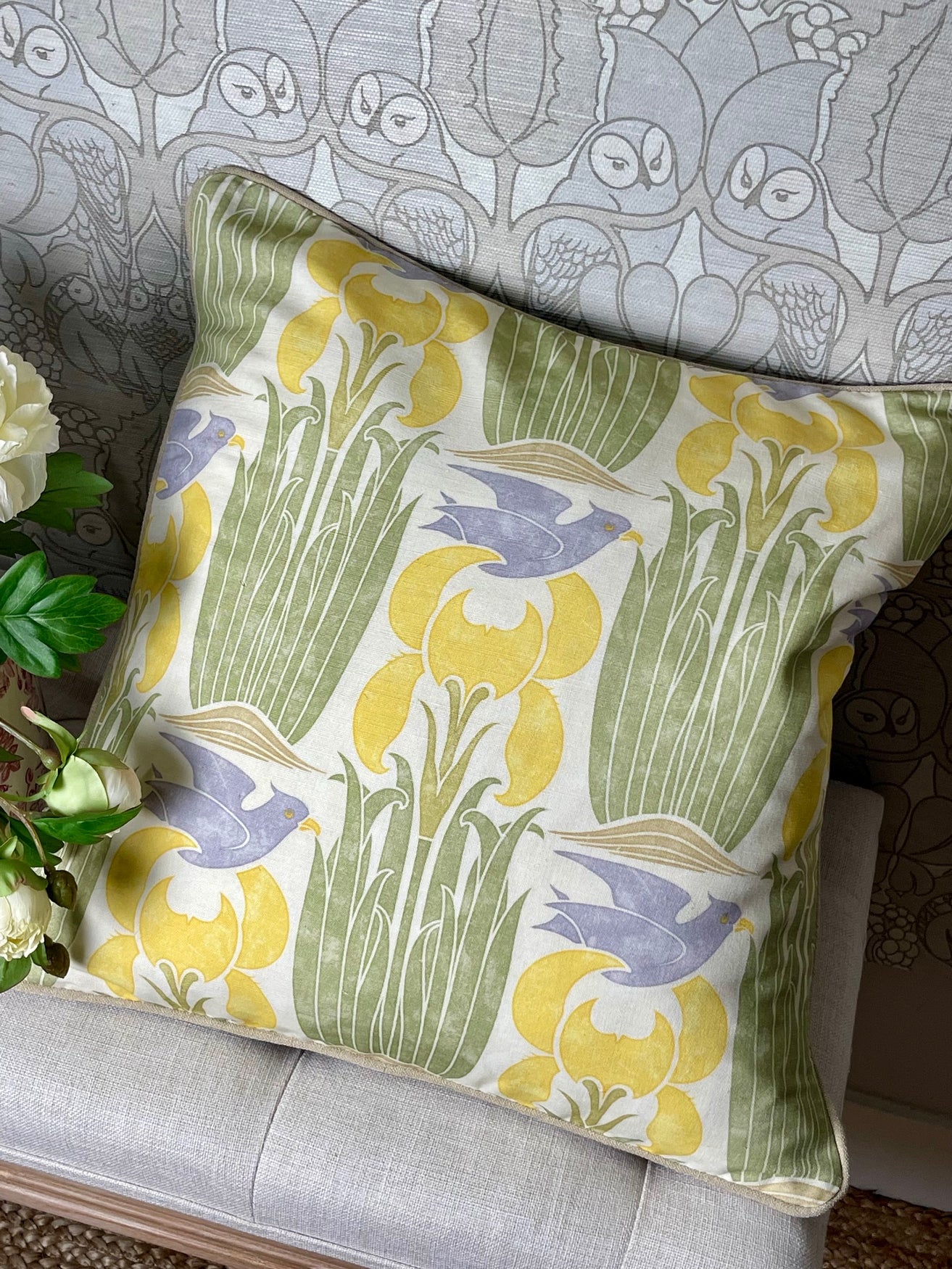 'The Merle' by C.F.A.Voysey is a characterful pattern of blue birds & yellow iris, that gives a timeless appeal with it's effortless simplicity.