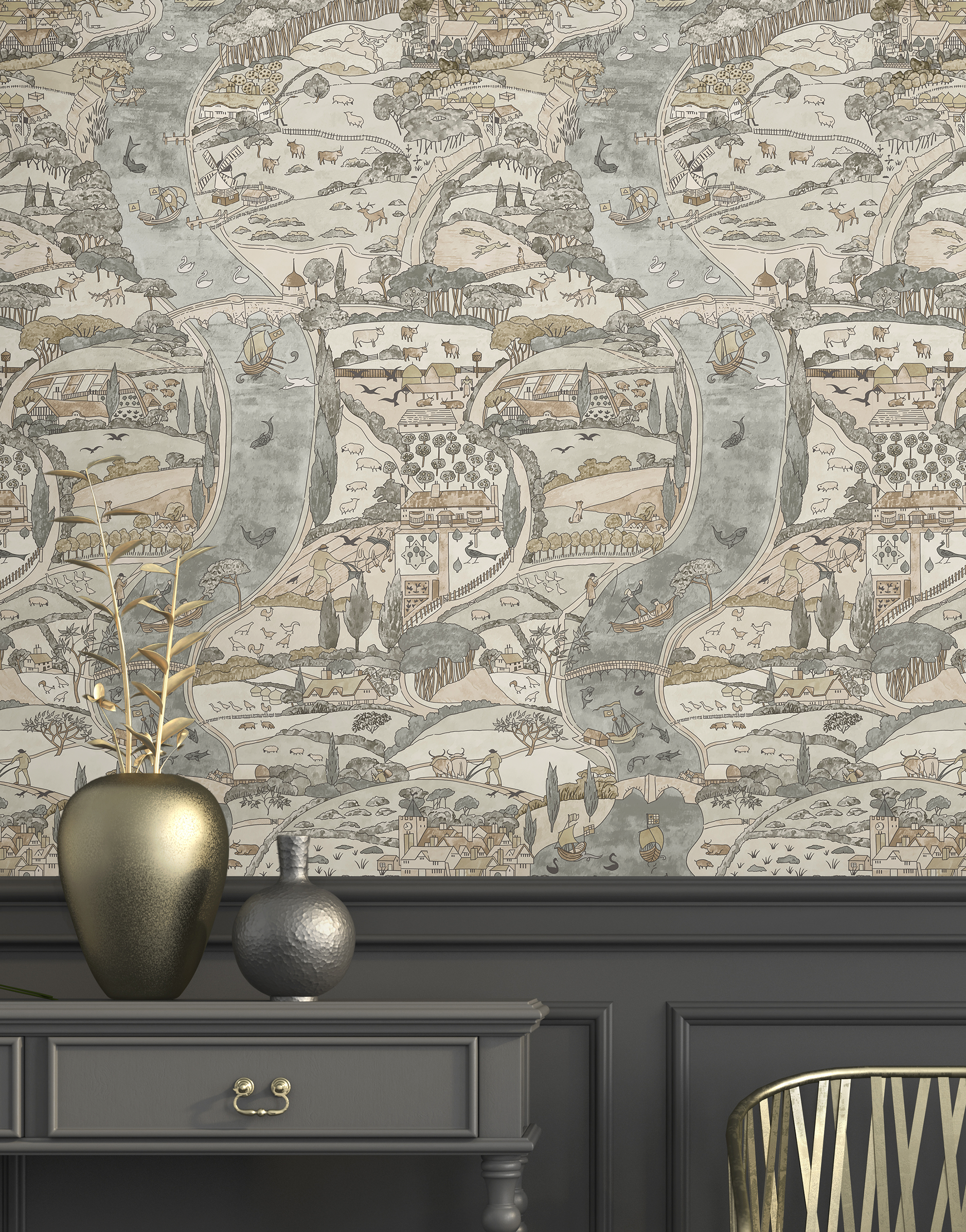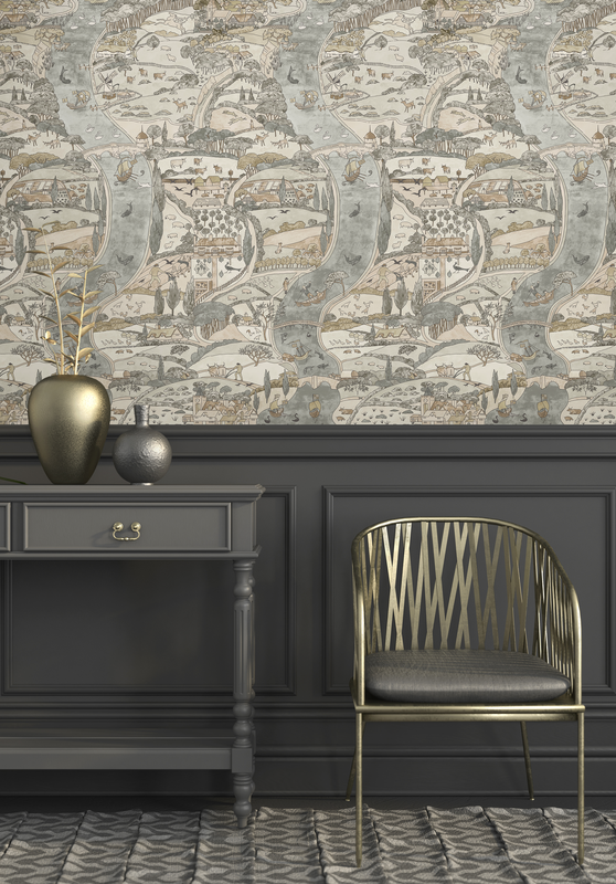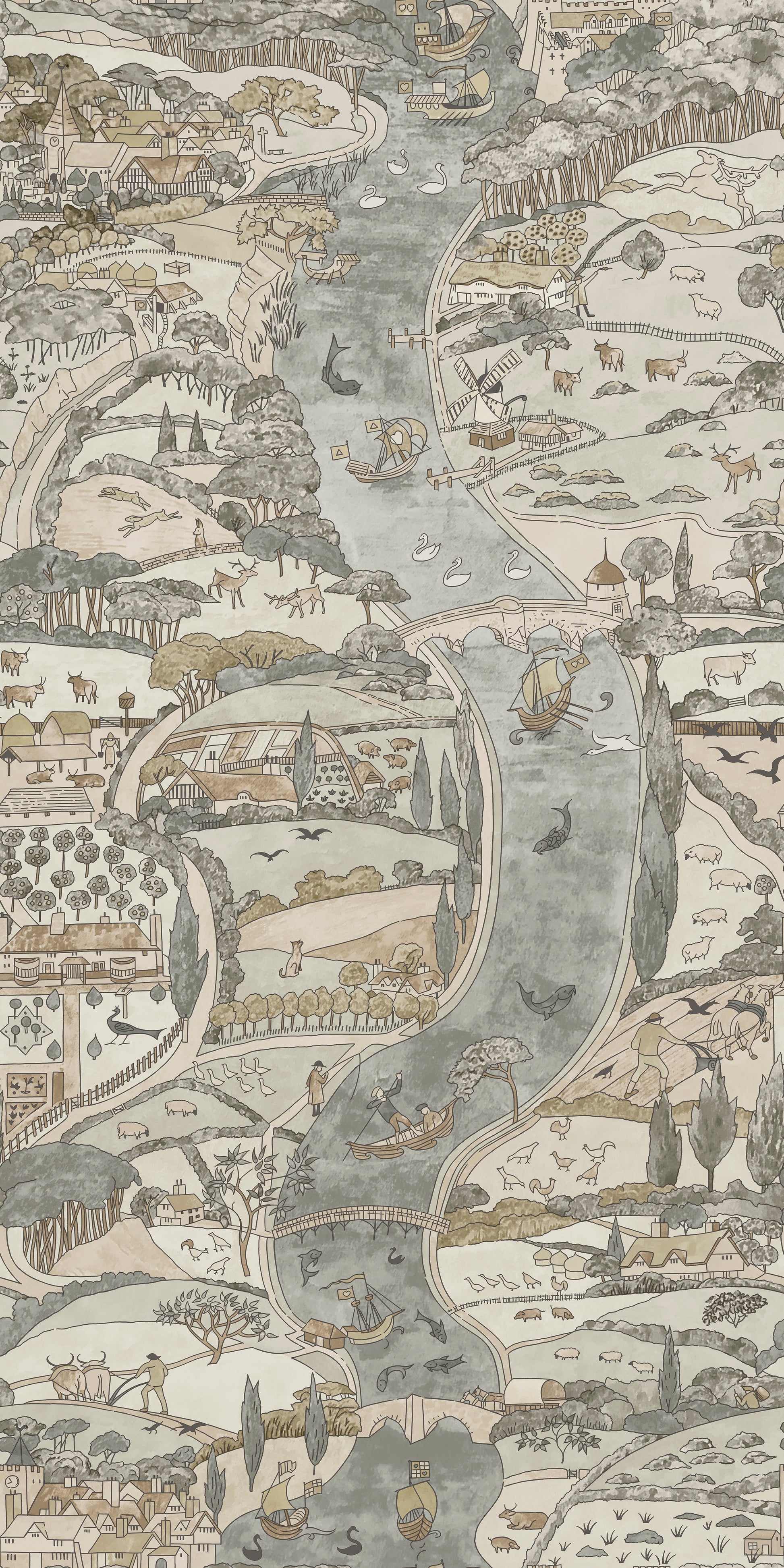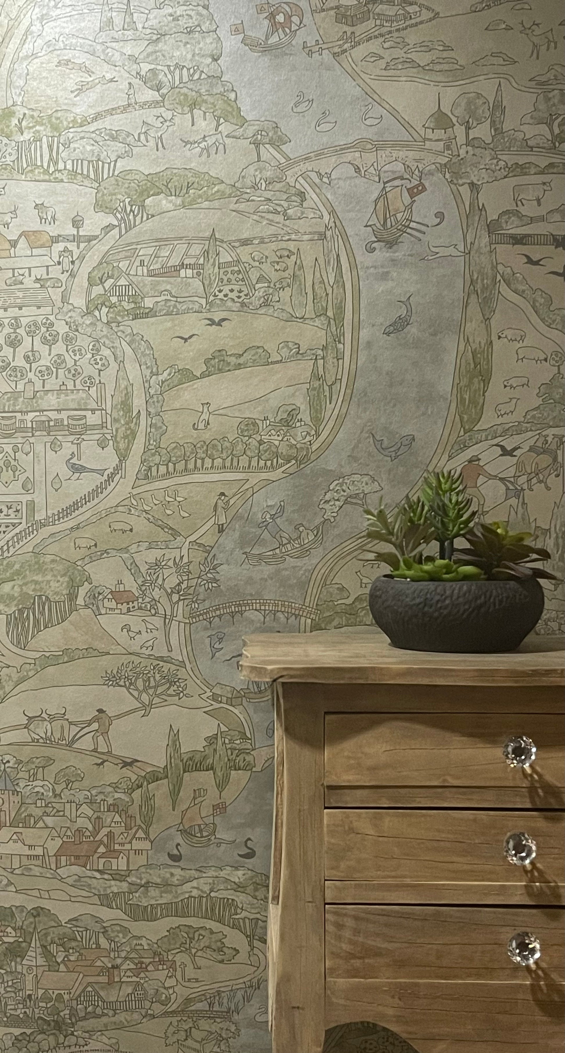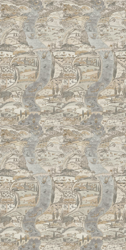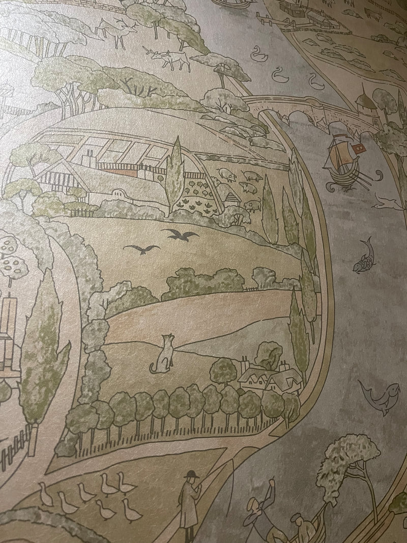 'Natural River' by C.F.A.Voysey is printed on a subtle shimmering mica, depicting a charming river flowing through an imagined medieval English landscape. Natural River is a smaller scale version of Voysey's 'The River'