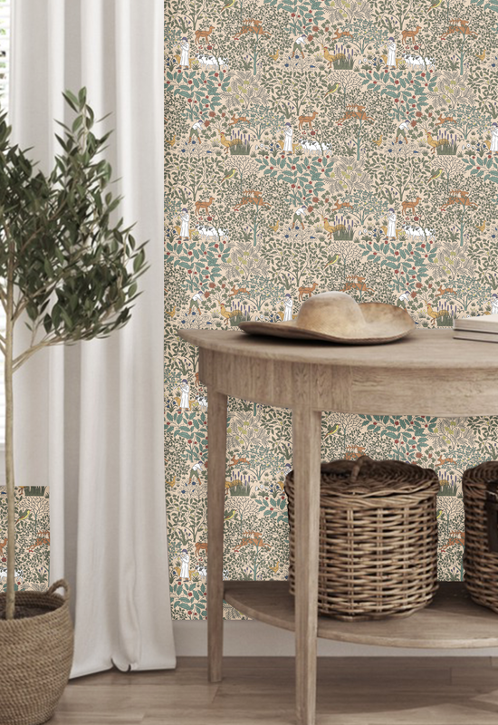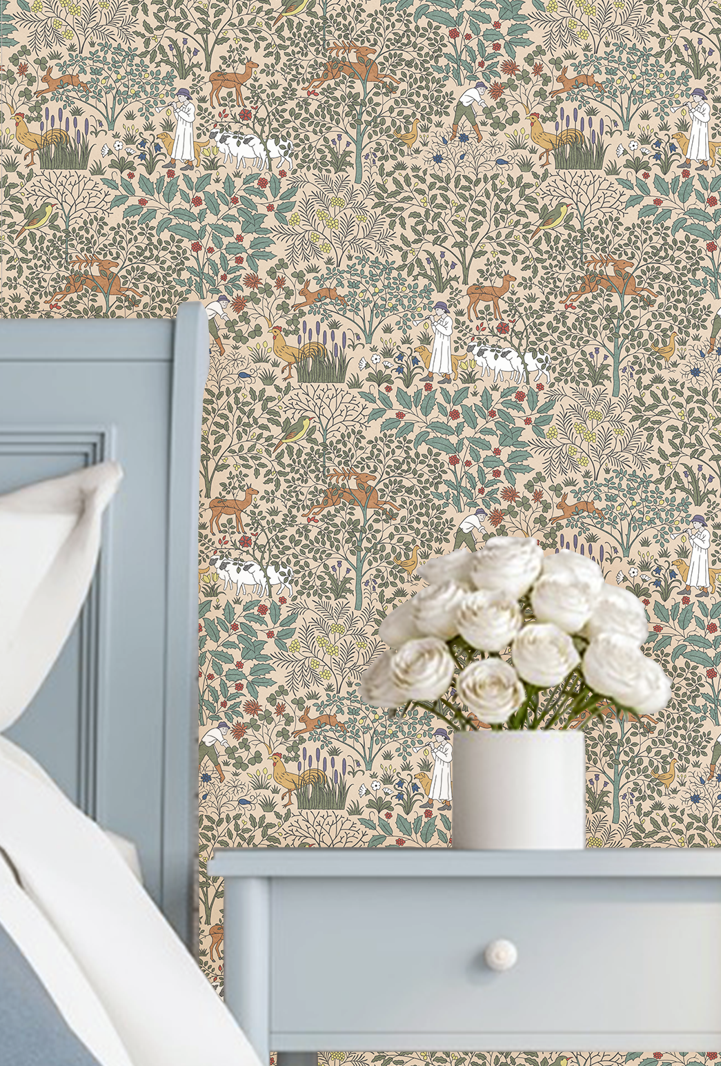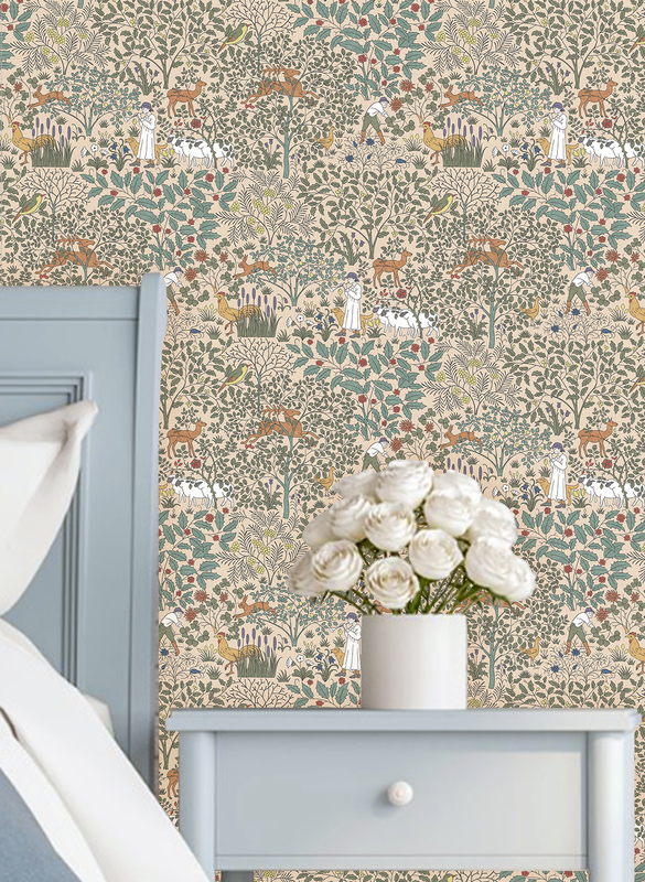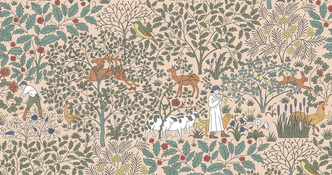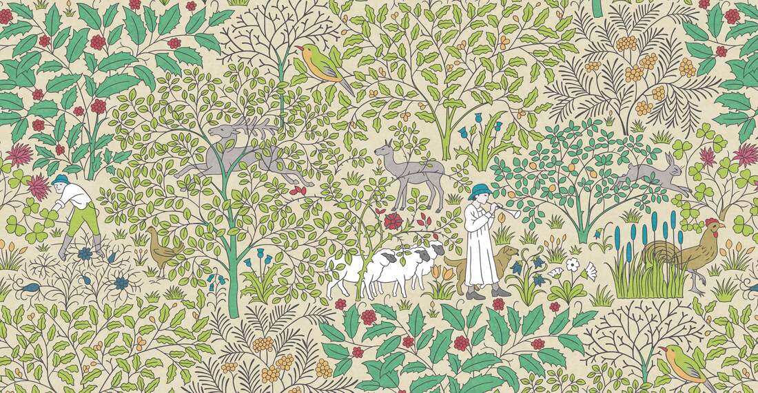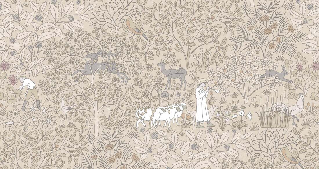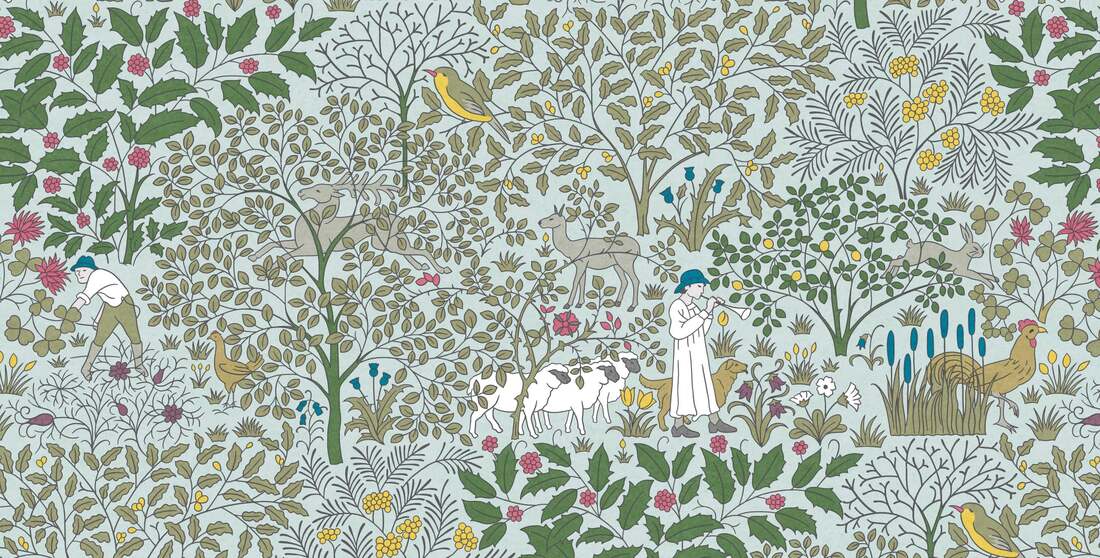 'The Shepherd' by C.F.A.Voysey creates a charming rural scene with animals, birds and foliage from the English farm & forest. This beautiful pattern is faithfully reproduced from the original designed by Charles Voysey the famous English architect and textile designer.