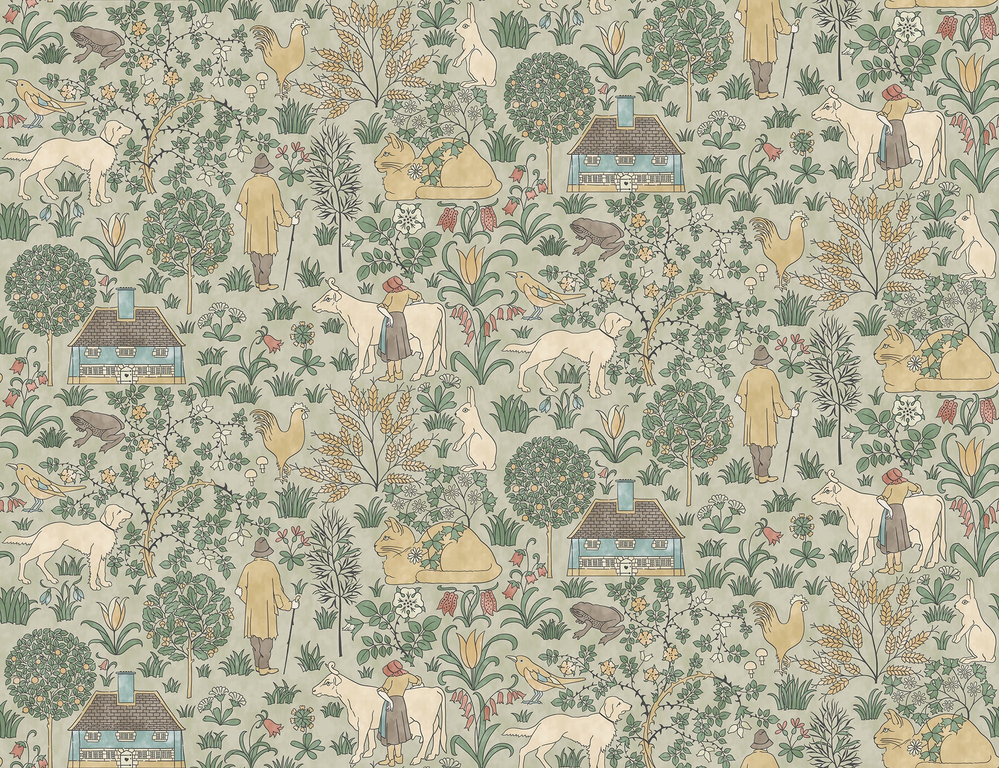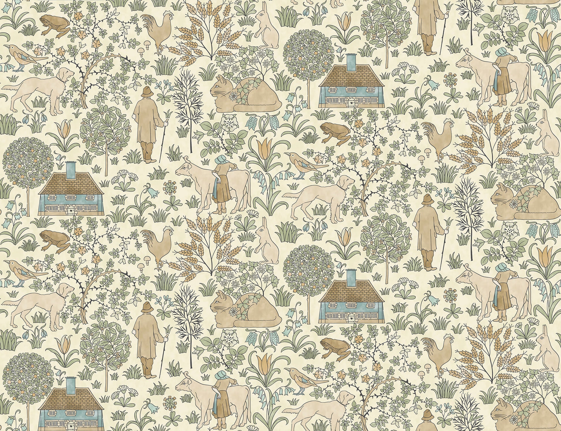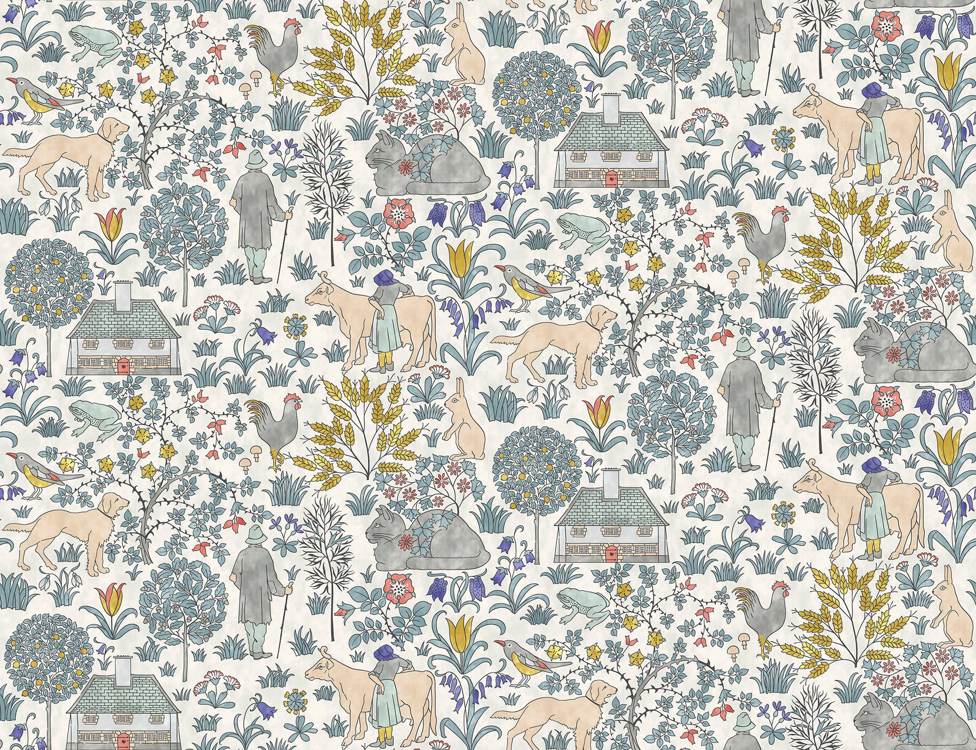 'The House That Jack Built' by C.F.A.Voysey features a delightful English farm, with beautifully drawn animals & flowers. This stunning pattern is faithfully reproduced from the original watercolour by Charles Voysey painted in 1929.