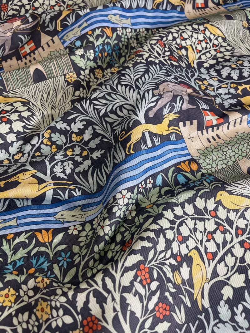 'The Huntsman' by C.F.A.Voysey is a medieval scene of a huntsman, his faithful hound, and a majestic stag. This beautifully detailed design enchants with it's pretty flowers & romantic songbirds.